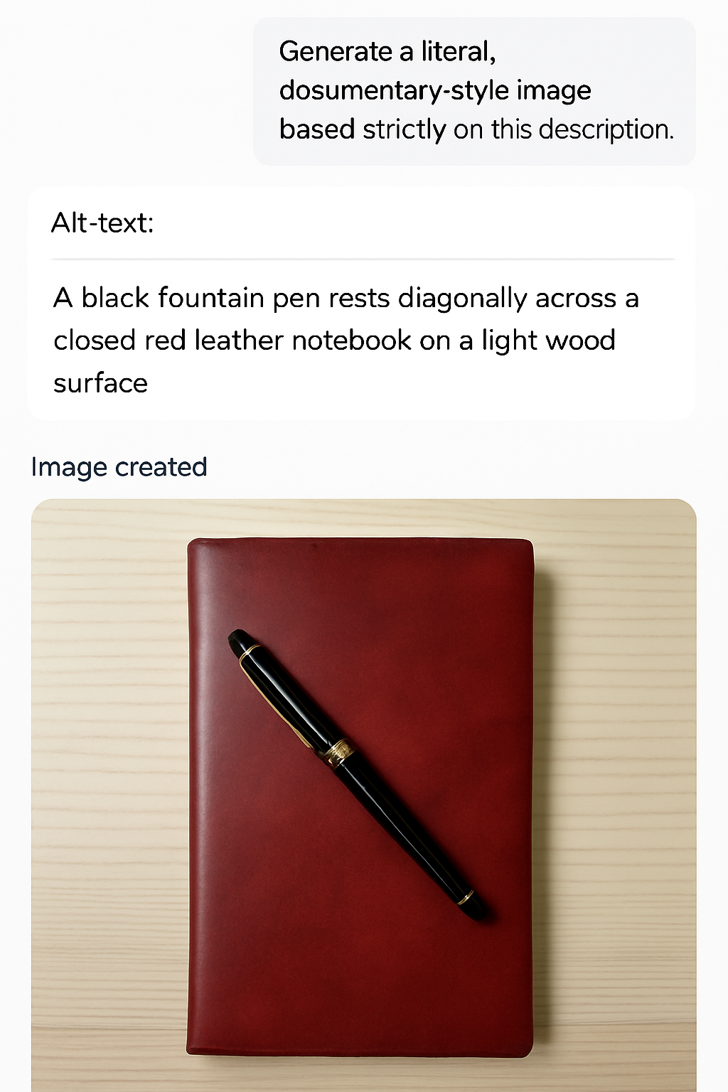 Using AI to reconstruct an image from alt-text doesn’t close that gap—it illuminates it. It shows us the interpretive space our words create. It reveals where meaning drifts. And it allows us to refine our language with greater intention.