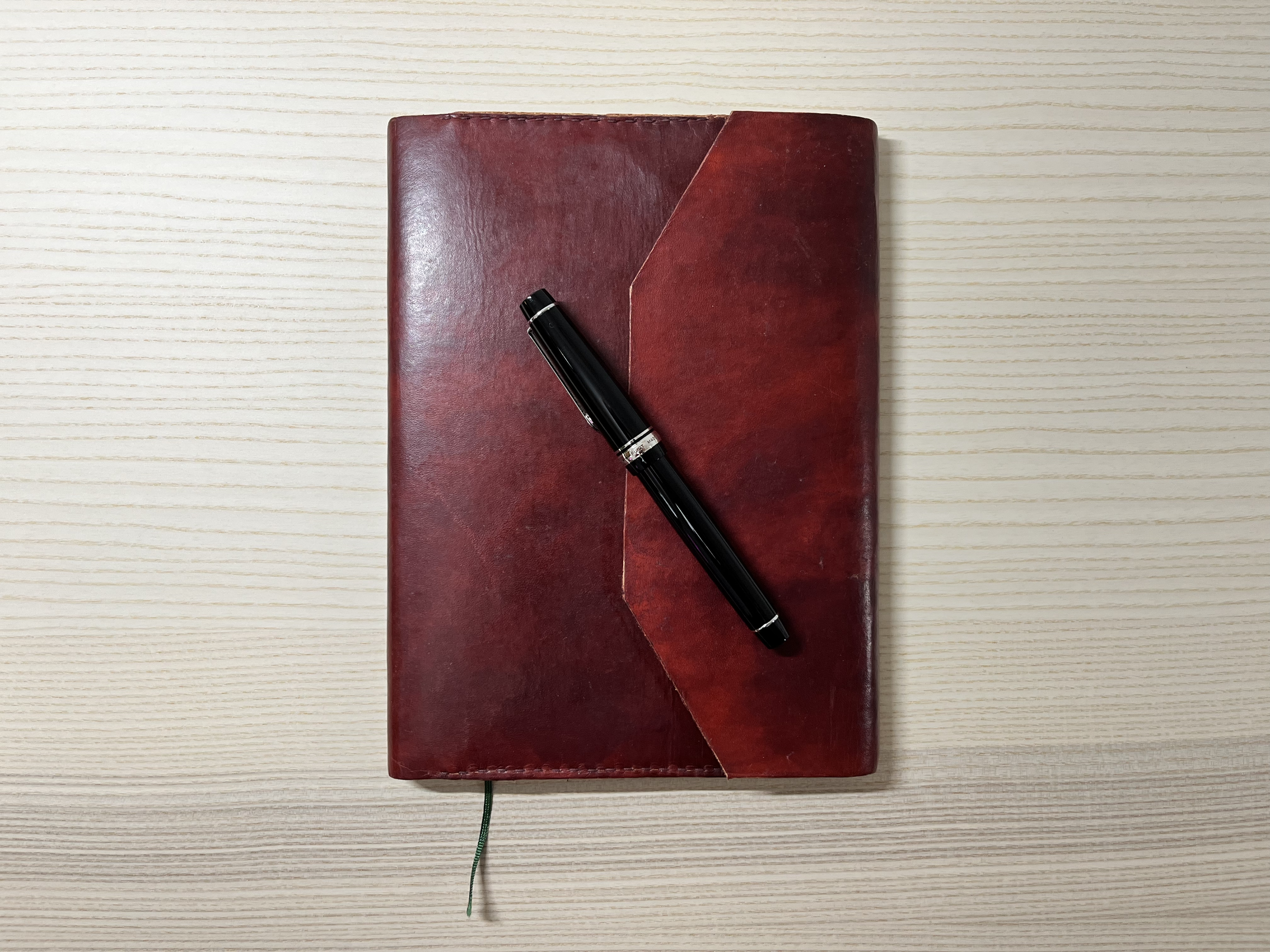 “A handmade red leather notebook cover with an asymmetrical front flap lies closed on a light wood table. The leather shows deep red and brown tones with a natural waxed sheen. A black fountain pen with silver accents rests diagonally across the center of the notebook.”